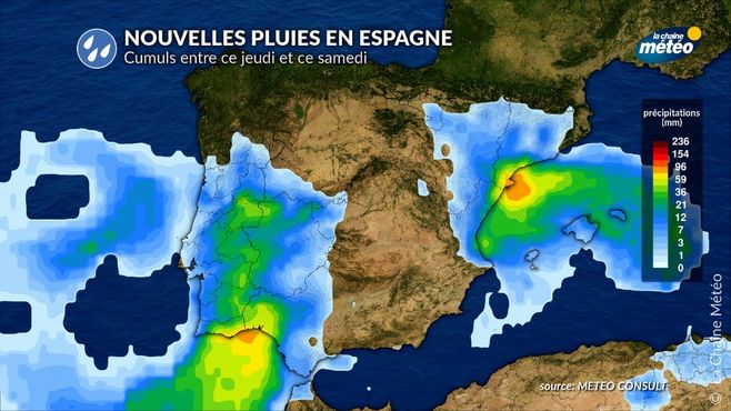 D'autres pluies assez importantes sont attendues sur l'extrême sud du Portugal et l'ouest de l'Andalousie d'ici ce samedi avec des cumuls totaux qui pourraient avoisiner les 100 mm en 48h, soit plus d'un mois de précipitations.