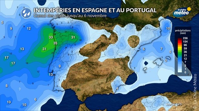 Mais, c'est désormais vers le Portugal que l'attention se porte. En effet, la tempête tropicale Patty, née à l'ouest des Açores vendredi, vient de balayer l'archipel où il est tombé jusqu'à 100 mmm d'eau dans la commune d'Horta lors de ces dernières 24 heures. Cette nouvelle tempête tropicale se dirige plein est, vers le Portugal. En accostant au Portugal dans la nuit de lundi à mardi, Patty aura entre temps perdu ses caractéristiques tropicales : il s'agira d'une simple dépression. Néanmoins, il faut s'attendre à de fortes pluies sur le nord du Portugal, dans les régions de Porto et Braga, ainsi qu'entre Vigo et La Corogne pour le nord de l'Espagne.