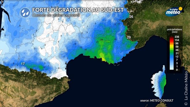 Ce mardi, une goutte froide traverse rapidement la France du nord au sud. L'air froid qui déboule à son passage, en arrivant sur les eaux encore douces de la Méditerranée, est à l'origine du creusement d'un petit minimum au large de la Provence. Ce petit minimum est à considérer, car il est à l'origine d'une brève, mais forte dégradation pluvio-orageuse et venteuse en Provence-Alpes-Côte d'Azur ainsi que sur l'est de la Corse ce mardi.
