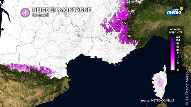 Avec le passage de cette perturbation, des chutes de neige se produiront dès 1600 mètres sur le sud des Alpes. Dans le massif du Mercantour, on attend jusqu'à près de 40 cm de neige au-dessus de 2500 mètres. Un effet d'isothermie est possible et localement, la limite pluie / neige pourra descendre plus bas, à près de 1000 mètres d'altitude dans le nord du Var et 1400 m en dessous d'Isola 2000. Cette neige pourra temporairement contrarier la circulation du réseau routier secondaire d'altitude. En l'espace d'1h, il pourra tomber 10 cm de neige qui fondra rapidement l'après-midi en dessous de 1500 mètres d'altitude.