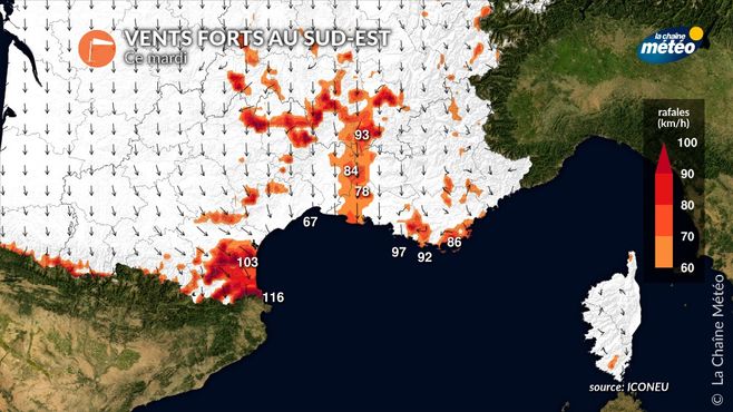 Rafales de vent au sud-est ce mardi © la chaîne météo