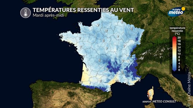 Les températures entament leur baisse. Il fait entre 8 et 11°C, soit 2°C sous les moyennes. Le ressenti très frais, voire froid est accentué par la bise au nord, les pluies, les averses et le violent mistral dans le sud. À titre d'exemple, le ressenti sera de 7° à Marseille sous les orages et le mistral à 90 km/h.