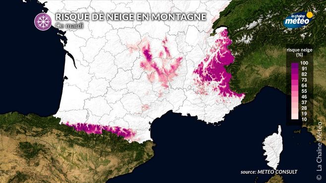 Avec la plongée de la goutte froide vers le sud, le temps instable se généralise à de nombreuses régions. Entre les Pyrénées et le sud de Rhône-Alpes, les averses sont fréquentes. Prudence, entre la Provence-Côte d'Azur et la Corse, les averses peuvent prendre un caractère orageux marqué avec un risque de grêle. En montagne, il neige au-dessus de 1000 mètres. La burle souffle fort sur le sud du Massif central. Prudence, si vous circulez sur le réseau d'altitude, ne vous laissez pas surprendre par la neige ! Ailleurs, le ciel se dégage enfin dans le nord-ouest dans une ambiance refroidie par une bise sensible.