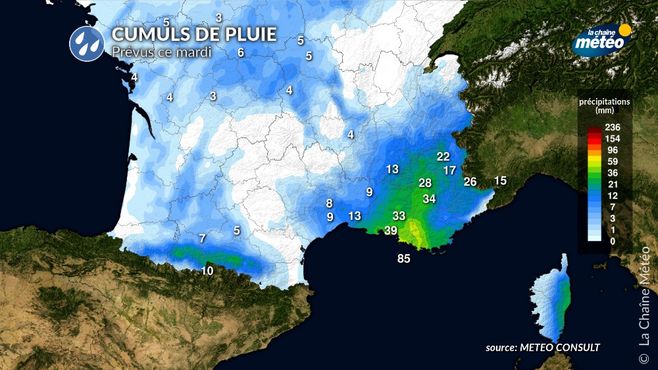 Cumuls de pluie attendus au sud-est ce mardi © La Chaine Météo