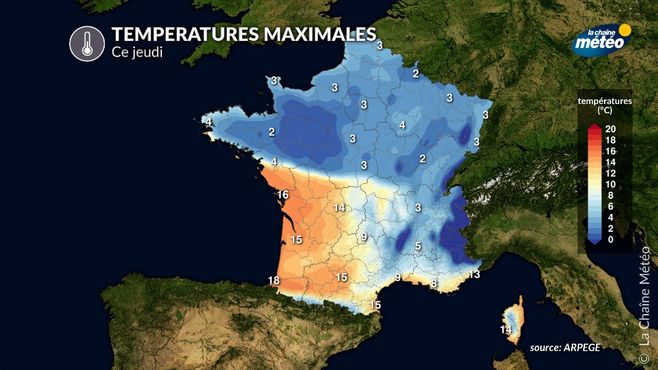 La France va se situer jeudi au centre d'un conflit de masses d'air, entre l'air froid qui déboule des îles britanniques par le flux polaire maritime, et l'air très doux qui remonte par le sud-ouest. Cette séparation de ces deux masses d'air va se faire via une dépression qui passera au cours de la journée d'ouest en est. Le centre-est sera au cœur de ce conflit, avec une bataille entre l'air chaud et l'air froid qui s'annonce rude tout au long de cette journée.
