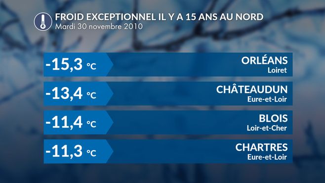 Mardi 30 novembre, un froid glacial s'abat sur le centre de la France. La conjonction d'un sol enneigé, d'une nuit étoilée et d'un air polaire en altitude accentue le rayonnement. La température descend à -16,8°C à Guillon (28), -15,3°C à Orléans (45), -13,4°C à Châteaudun, -12,6°C à Mulhouse (68), -11,4°C à Blois (41), -11,3°C à Chartres (28). Il s'agit des températures les plus basses jamais enregistrées en plaine pour un mois de novembre.