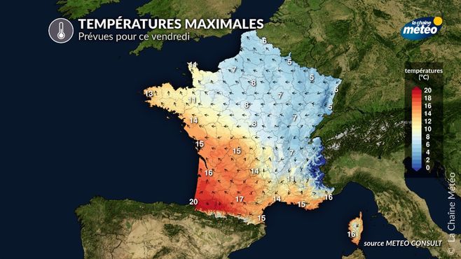 Températures maximales contrastées prévues ce vendredi © la Chaine Météo