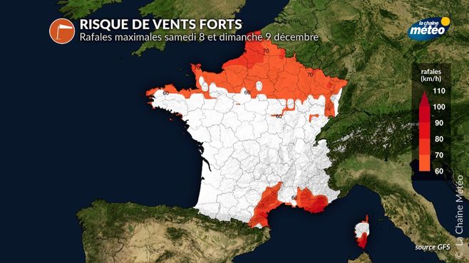 Après un samedi déjà très agité et venté avec un risque de coup de vent à 100 km/h dans le nord de la France, les températures vont chuter dimanche. Dimanche, les régions méditerranéennes pourraient être concernées par des rafales tempétueuses de mistral et de tramontane, au moment de l'arrivée d'air polaire en mer.