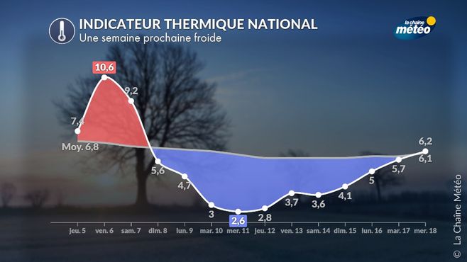 Toute la semaine prochaine sera froide, le jour le plus froid sera probablement mercredi avec un indicateur thermique national prévu à +2,6°C, ce qui serait la journée la plus froide depuis le 21 janvier dernier. Les maximales de l'après-midi devraient se situer entre 2 et 5°C sur une large moitié nord, et de 4 à 9°C dans le sud, où le déficit par rapport aux normales sera le plus marqué. Les nuits devraient voir des températures comprises entre -3 et +3, avec des -10°C dans les stations de montagne. Ce froid devrait se maintenir jusqu’au week-end du 15 décembre. Ensuite, un changement de temps pourrait se mettre en place avec le retour du flux océanique humide et doux par l’ouest. Ce flux océanique pourrait s’imposer en vue des vacances de Noël.
