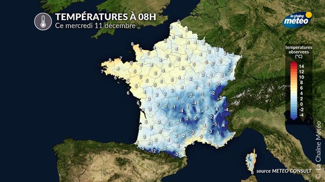 Les températures évoluent de -2 à 8°C du nord au sud, notamment au centre-est sous un ciel clair permettant aux températures de baisser par effet de rayonnement dans ces régions. On observe jusqu'à -10°C dans certaines combes du Jura.