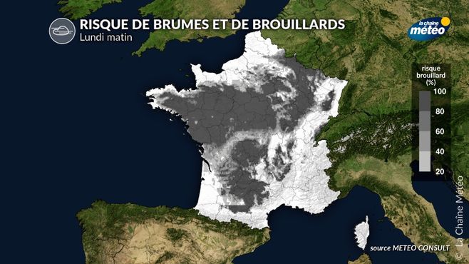 Prudence, car les nuages bas, les brumes et les brouillards sont très nombreux et réduisent fortement la visibilité en plaine. Un peu de bruine est même possible par endroit, ne nécessitant pas le parapluie en raison de pressions élevées (autour de 1035 hPa). En revanche, sur les Vosges, le Jura, les Alpes, le Massif central et les Pyrénées, au-dessus des nuages des plaines et des vallées, c'est le soleil qui s'impose. Vous bénéficiez du beau temps près de la Méditerranée sous un mistral et une tramontane qui commencent à faiblir.