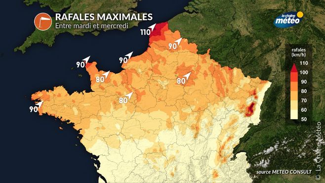 Notre modèle ensembliste METEO CONSULT envisage un scenario de vent forts sur l'extrême nord : le vent balaiera les côtes de la Manche à plus de 110 km/h sur les Hauts-de-France. Dans les terres, le vent pourrait atteindre 80-90 km/h de la Bretagne aux Ardennes en passant par le nord du bassin parisien, la Champagne et le nord de la Lorraine et des Vosges entre mercredi après-midi et jeudi matin.