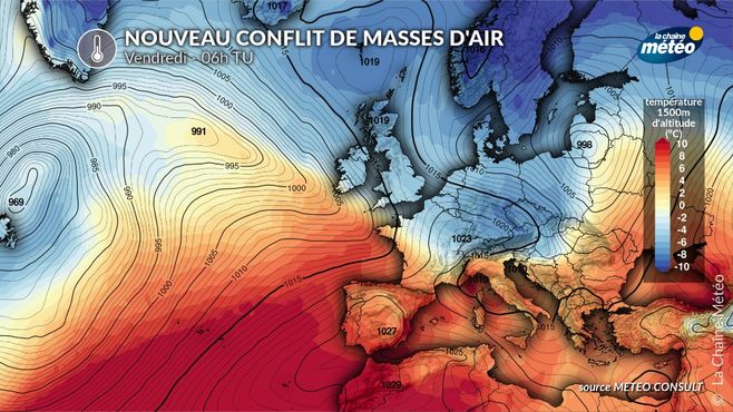 La France reste cette semaine au cœur d'un conflit entre deux masses d'air qui se battent « en duel ». L'une provient du pôle, l'autre des tropiques. Ces deux masses d'air sont séparées par le courant-jet, qui actuellement oscille à nos latitudes. Pour ce vendredi, c'est une nouvelle perturbation qui va affecter le pays et qui va matérialiser le conflit entre ces deux masses d'air.