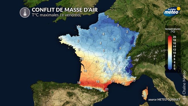Après le conflit de masses d'air cantonné à l'extrême nord mercredi, engendrant de la neige, ce vendredi verra un conflit plus généralisé et important entre l'extrême nord et l'extrême sud. Ainsi, un écart de 20°C est possible entre Lille et Perpignan au meilleur der la journée de vendredi.