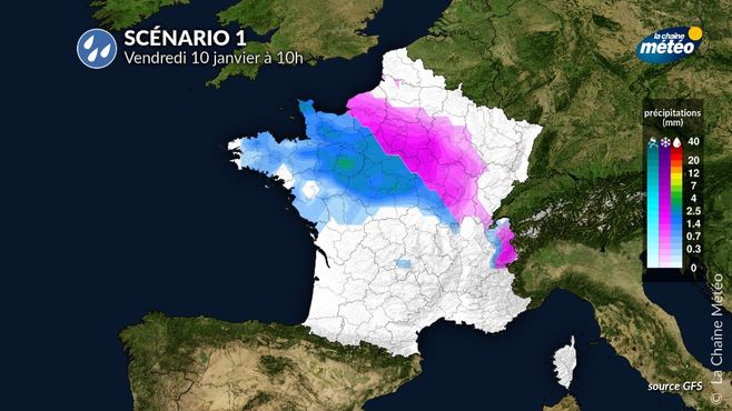 Les scénarios divergent fortement, puisque la zone de conflit est encore imprécise à ce jour. Globalement, la zone la plus à risque de voir la neige tomber se situe entre la Basse-Normandie et la région centre, non loin du bassin parisien. Tout se jouera à quelques kilomètres, avec le niveau des températures.