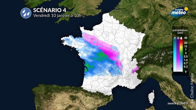 D'autres modèles, comme le modèle allemand ICON ou européen, voient le conflit neigeux plus à l'ouest et au sud. Dans cette configuration, le bassin parisien ne serait pas touché et resterait dans l'air froid sec.