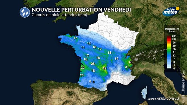 Vendredi, une dernière perturbation océanique traversera la France, mais la fiabilité est encore limitée quant à son activité et sa trajectoire précise. Les régions de l'ouest et du centre seraient les plus exposées aux pluies alors que le nord-est du pays resterait à l'écart avec un temps plus froid et sec. Il faudra surveiller un risque de neige entre la Normandie et la Bourgogne, au nord de la zone de précipitations, en limite de l'air le plus froid. Si notre modèle Météo Consult privilégie ce scénario, certains modèles envisagent une remontée plus au nord de la perturbation.