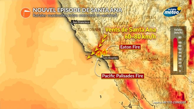 Le bureau du Service National de Météorologie a émis une alerte pour une "situation particulièrement dangereuse" de 4 heures du matin mardi (heure locale) jusqu'à 12h mercredi, indiquant que les vents pourraient être suffisamment forts pour provoquer une "croissance explosive des incendies." Les vents de Santa Ana commençaient déjà à souffler ce lundi soir avec des rafales atteignant déjà les 60 à 80 km/h sur les reliefs au nord de Los Angeles. Ce mardi sera la journée la plus à risque avec un pic d’intensité et des rafales supérieures à 80 à 100 km/h. Ce sont encore les mêmes secteurs qui seront les plus concernés par ces vents violents, en particulier ceux de l’Eaton Fire et le quartier de Pacific Palisades. Néanmoins, les vents n’atteindront pas les niveaux de la semaine dernière où le vent avait soufflé jusqu’à 160 km/h.