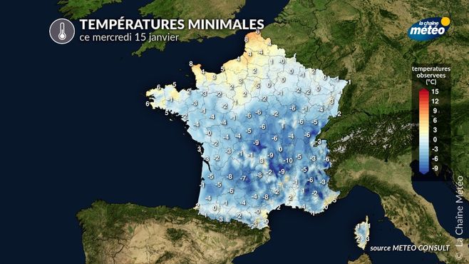 Après un début de semaine bien lumineux malgré quelques brouillards givrants, la grisaille brumeuse est de retour toute la journée sur les deux tiers nord du pays. Les gelées restaient fortes au sud de la Loire avec la persistance d'un temps lumineux vers le sud du pays.
