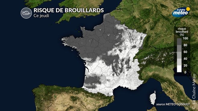 Ce jeudi, l'anticyclone maintient une masse d'air très humide en matinée sur les 3/4 de la France, ce qui se traduit pas de nombreux nuages bas et brouillards. Dans l'après-midi,de l'air un peu plus continental revient par le nord-est avec le retour de belles éclaircies. En Méditerranée, le temps devient plus instable avec un ciel plus nuageux et quelques précipitations sur la Corse et le Roussillon.