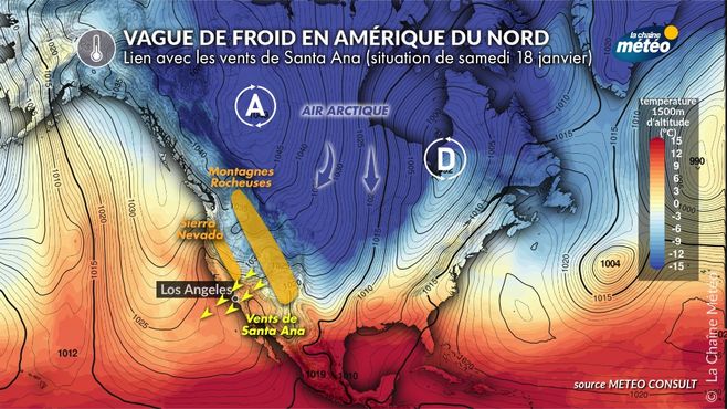 À partir de ce week-end, la vague de froid nord américaine va s'intensifier. De l'air très froid envahira les deux tiers du continent, ce qui provoquera une nouvelle levée du vent de Santa Ana dès lundi sur la zone de Los Angeles. Si d'ici là, les feux ne sont pas circonscrits, la situation pourrait alors être très défavorable. Ces fluctuations pourraient persister tout au long de ce mois de janvier.