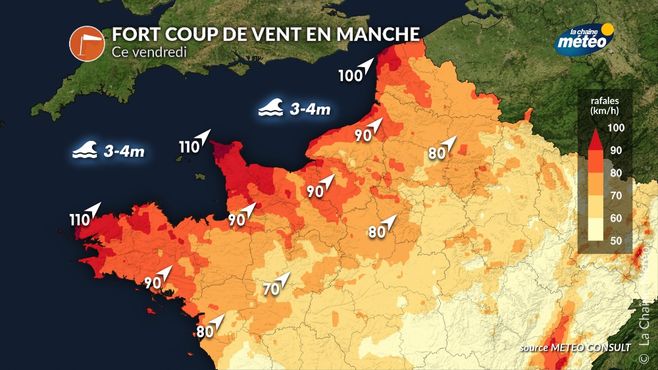 - fort coup de vent (rafales à 110 km/h) le long des côtes de la Manche