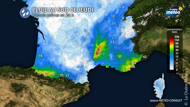 La dépression Ivo, responsable du mauvais temps de mercredi, se comble sur les Pyrénées ce jeudi avec quelques pluies. De l'instabilité remonte également de Méditerranée avec de fortes pluies sur les Cévennes.
