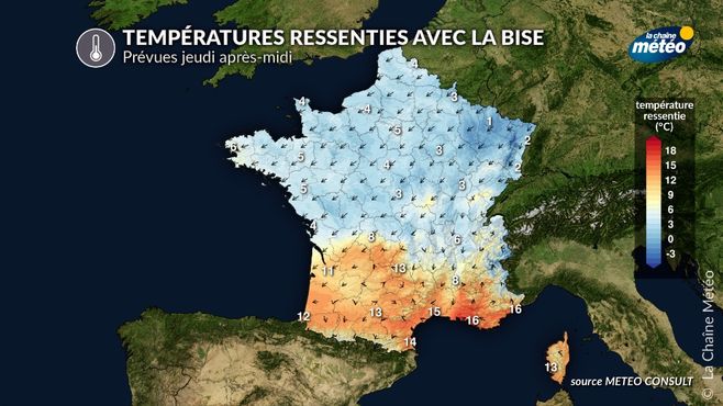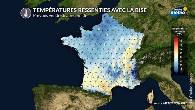 Température ressentie prévue vendredi avec la bise © La Chaine Météo