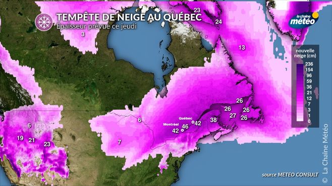 Epaisseurs de neige attendues ce jeudi au Québec © La Chaine Météo