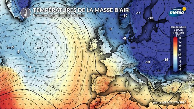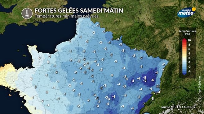 Dès ce vendredi matin, la bise venant d'Allemagne dégage le ciel et fait baisser les températures, surtout au nord-est. La nuit la plus froide sera celle de samedi. Il pourra faire -3 à -5°C avec localement jusqu'à -8 à -10°C sur les sols enneigés des reliefs (Vosges, Jura, Ardennes). Au niveau national, les températures seront très contrastées car il fera remarquablement doux au sud-ouest.