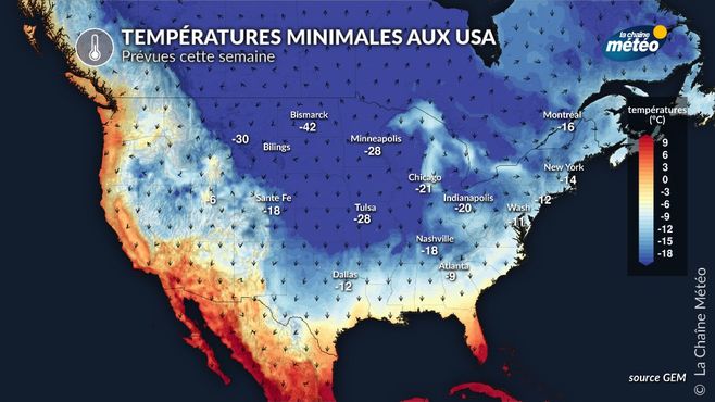 Alors que le Québec et le nord des États-Unis viennent de subir un nouveau blizzard avec 30 à 50 cm de neige au sol ce week-end, les grands froids se généralisent aux deux tiers du continent cette semaine avec des températures extrêmes jusqu'au Texas. De possibles records absolus pourraient être battus avec jusqu'à -48°C au Canada.