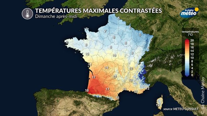 Températures maximales contrastées dimanche après-midi © la chaîne météo