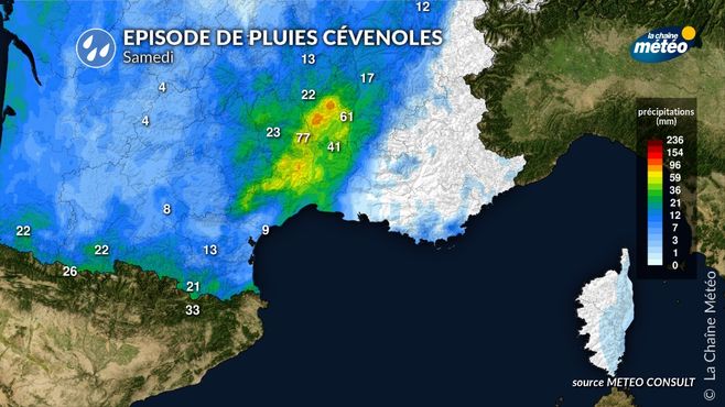 - pluies sur les Cévennes, jusqu'à 100 mm