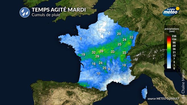 Ce mardi constitue la journée la plus perturbée de la semaine avec des pluies actives, parfois orageuses sur la côte atlantique et le retour de la neige à moyenne altitude sur les Alpes.