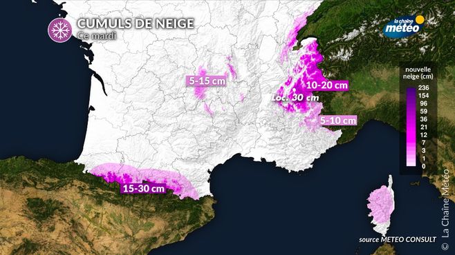 Ce mardi matin on retrouvera la perturbation du sud-ouest au nord-est avec des pluies soutenues et de la neige encore assez haute altitude sur les Pyrénées. Ce sera de la pluie à toute altitude sur les reliefs de l’est et le massif central. Dans l’après-midi, avec le refroidissement, la neige s’abaissera sur l’ensemble des massifs et tiendra au sol dès 1200 à 1500 mètres en général. C’est la nuit uivante que les chutes seront les plus significatives sur les Alpes-du-nord et le Jura et ce dès 700 mètres en fin de nuit. On attend en moyenne vers 1200 mètres, 10 à 20 cm sur les Alpes du nord, 15 à 30 cm sur les Pyrénées mais seulement 5 à 15 cm sur le Massif central et 5 à 10 cm sur les Alpes-du-sud.