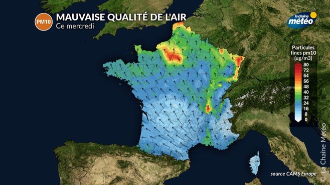 Un dépassement du "seuil d'information" en Particules fines PM10 se produit ce mercredi sur le bassin parisien notamment, la plaine d'Alsace et le lyonnais. Dans le sud, la présence du vent va limiter ce risque. Dans les grandes agglomérations et les bassins comme l'Ile-de-France, ce pic de pollution s'explique surtout par les inversions thermiques : les polluants (particules fines) sont bloqués dans les basses couches de l'atmosphère en raison de l'air plus doux en altitude qui forme un couvercle. La situation s'améliorera dès jeudi, car il y aura moins d'inversions thermiques et un peu plus d'air l'après-midi.