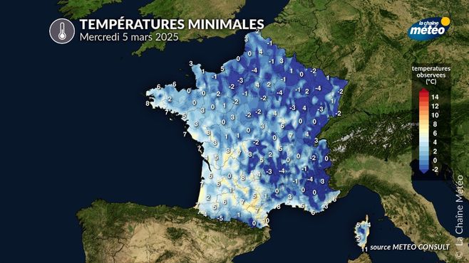 Si vous avez des activités extérieures de prévu, c'est le bon jour pour en profiter. A l'échelle nationale, c'est la plus belle journée de la semaine du nord au sud. Le matin, quelques gelées sont encore prévues sur la moitié nord, mais sont plus faibles que lundi et mardi. On attend -1°C à Charleville-Mézières, 0°C à Rennes, et jusqu'à 10°C déjà en Corse.