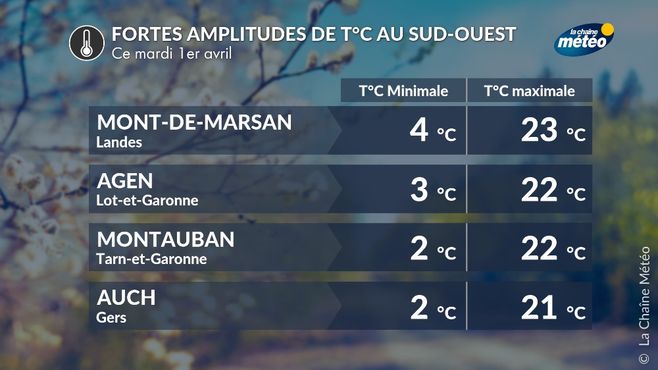 Mardi, les plus grandes amplitudes de températures concerneront les plaines et vallées du sud-ouest avec des températures de 2 à 4°C au lever du jour sur des villes comme Mont-de-Marsan, Agen, Montauban et Auch. Dans l'après-midi avec un soleil généreux et un vent faible, les températures atteindront 21 à 23°C soit près de 20°C d'écart en l'espace de quelques heures. Sur une large moitié nord, les amplitudes de températures seront moins importantes car la bise de nord-est limitera un peu la hausse des températures l'après-midi.
