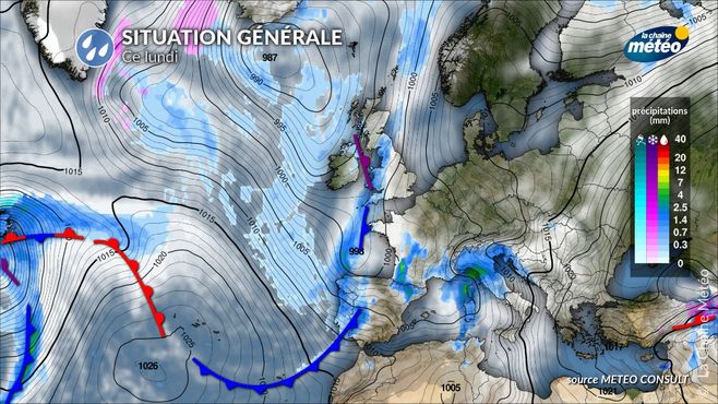 Si les pluies reviennent en force dans le quart sud-est, cela est lié au retour des dépressions atlantiques et de la péninsule ibérique qui reviennent affecter une partie du pays. C'est notamment l'axe entre le sud-ouest et le flanc Est qui est touché, le quart nord-ouest étant un peu en marge avec très peu de précipitations à prévoir.