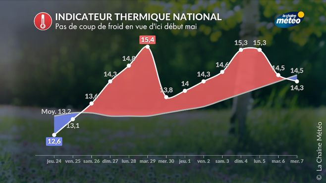 La tendance météo pour ces prochaines semaines ne semble pas aller vers un coup de froid tardif. Bien au contraire, après la relative fraîcheur de ces derniers jours, les températures devraient repartir à la hausse pour la fin du mois d'avril et le début du mois de mai. L'évolution de notre indicateur thermique sur les 15 prochains jours montre que les températures vont repasser au-dessus des normales de saison dès ce week-end avec une période de douceur durable jusqu'aux premiers jours du mois de mai.