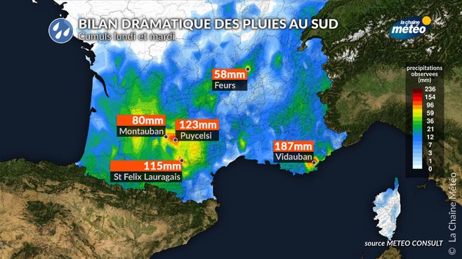 Ce mardi, la dépression s’est positionnée sur la Provence, son centre se bloquant temporairement au-dessus du Var. Ce blocage a été déterminant : il a permis la concentration d’orages stationnaires sur une zone limitée, notamment entre Les Mayons, Vidauban et Le Lavandou. Résultat : 104 mm de pluie en 2 heures aux Mayons, 187 mm à Vidauban, et plus de 150 mm à l’est du Lavandou, transformant les ruisseaux en torrents et submergeant routes et habitations. Toujours à Vidauban, entre 9h30 et 10h30, 124.2 mm d'eau sont tombés. Il s'agit d'un nouveau record départemental de pluie en 1h sur le Var, devant les 119 mm relevés en 1h le 25 octobre 2024 à la même station.