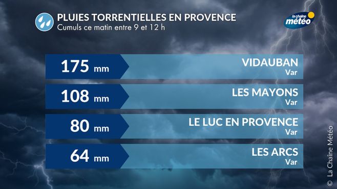 Ainsi, depuis 9 h ce matin, un violent orage stationne au-dessus du Var. Le sud du département subit des pluies torrentielles. Les secteurs de Cogolin, du Lavandou et de Cavalaire subissent des pluies torrentielles. Les cumuls sont impressionnants : à Vidauban, il vient de tomber 175 mm d'eau en 2h, correspondant à près de 3 mois de précipitations d'un mois de mai. À la mi-journée de ce mardi, le bilan provisoire fait état d'une victime et d'une autre personne portée disparue.
