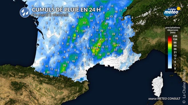 Cumuls de pluie de mardi 17 h à mercredi 17 h © La Chaine Météo