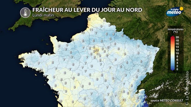 - la fraîcheur marquée au lever du jour sur une grande moitié nord (entre 6 et 10°C)