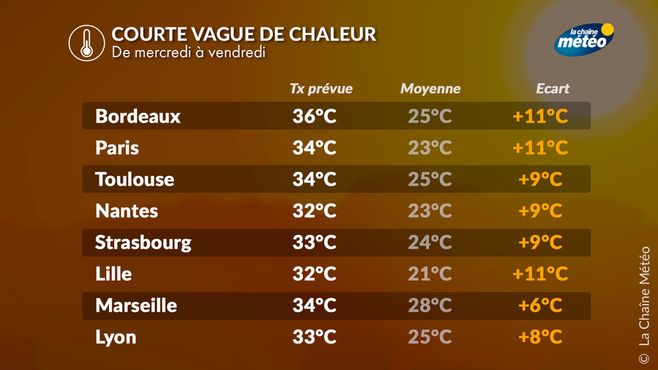 Le temps va d'abord se réchauffer par le sud mardi, avec des températures élevées, à presque 35°C sur l'Aquitaine. Mais c'est véritablement mercredi qu'un premier pic de chaleur est attendu dans le sud-ouest, avec des pointes à 38°C localement. Ces fortes chaleurs finiront par gagner la moitié nord du pays vendredi avec des températures qui avoisineront également les 35°C. Ce sera d'ailleurs la journée la plus chaude à l'échelle nationale.