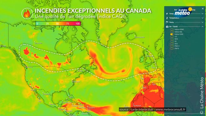 Les émissions de fumées deu Canada traversent l'Atlantique © Carte interactive : www.meteoconsult.fr