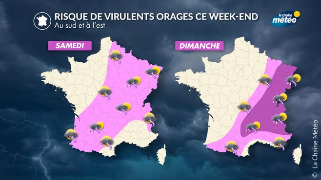 Dimanche, le risque d'orages persistera du Massif central aux frontières de l'est et dans une moindre mesure entre les Pyrénées et l'arrière pays méditerranéen. Les orages quitteront définitivement la France dans la nuit de dimanche à lundi avec le retour de conditions anticycloniques, très calmes en début de semaine prochaine.