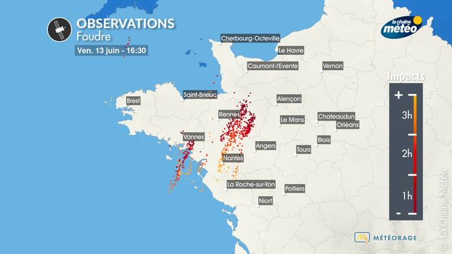 A 15h30, des orages éclatent entre le sud de la Bretagne et les Pays de la Loire en donnant localement un peu de grêle et des pluies intenses. Le pays nantais a été particulièrement touché en début d'après-midi. Il est tombé 29 mm en une heure à la station de Nantes-Bouguenais. Les orages gagnent du terrain vers l'Ille-et-Vilaine et la Mayenne. D'autres orages arrivent par le golfe du Morbihan et vont remonter vers les côtes d'Armor.
