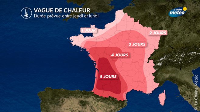En terme de durée, c'est donc une vague de chaleur de 3 à 5 jours que subiront de nombreuses régions. Le littoral de la Manche échappera en grande partie à cette vague de chaleur en raison du vent marin qui limitera la hausse des températures en journée.