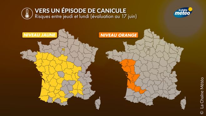 Dès jeudi et vendredi, une alerte canicule de niveau jaune et orange devrait concerner pas mal de départements de l'ouest et du sud et un peu plus tardivement la région parisienne et certains départements du centre-est. Le niveau d'alerte orange pourrait être atteint entre les Pays de la Loire et l'Aquitaine avec des seuils de canicule dépassés 3 jours et 3 nuits consécutifs. Pour les départements en niveau jaune, les seuils de canicule devraient être atteints pendant au moins 2 jours et 2 nuits consécutives.